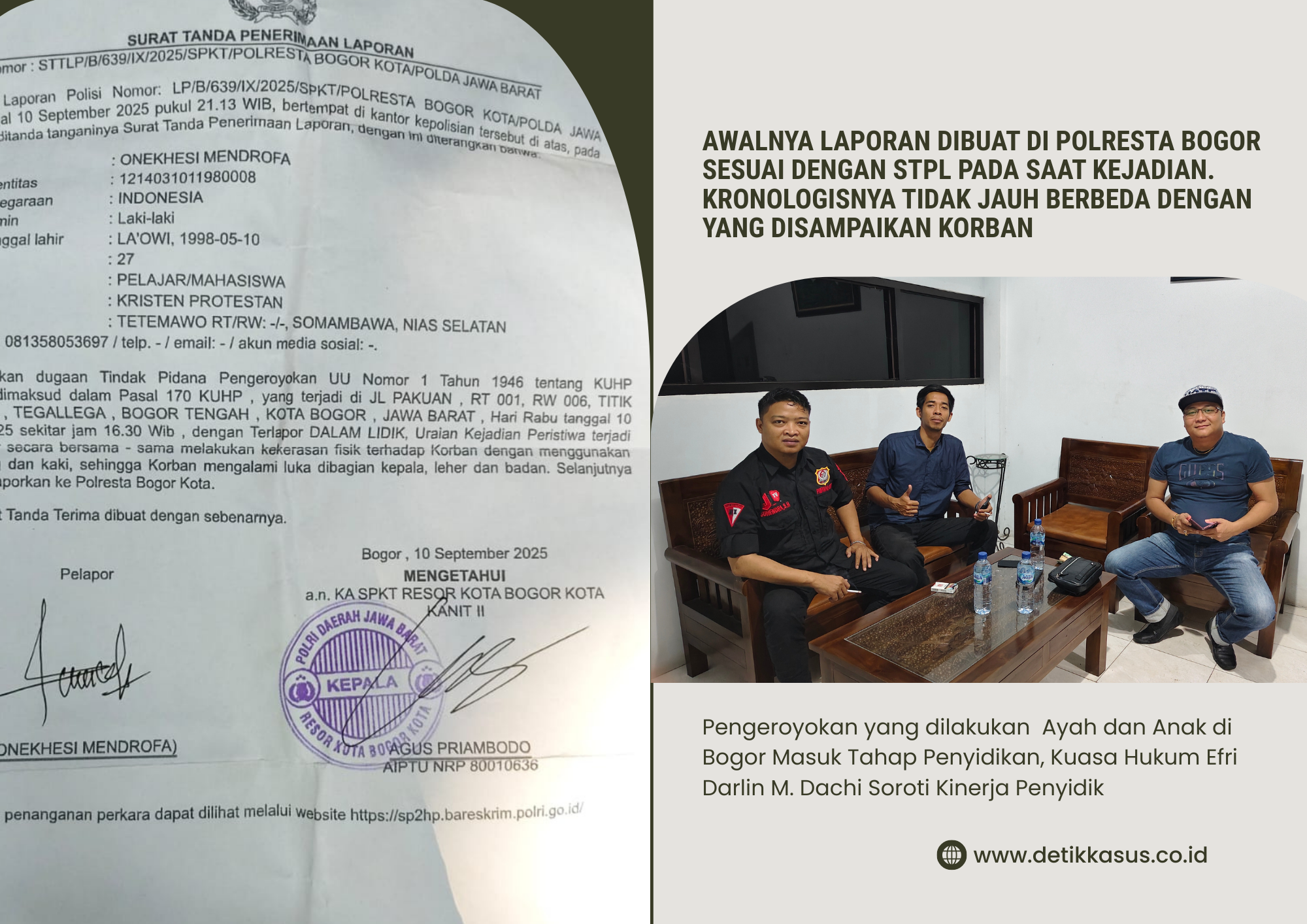 “Awalnya laporan dibuat di Polresta Bogor sesuai dengan STPL pada saat kejadian. Kronologisnya tidak jauh berbeda dengan yang disampaikan korban. Namun, dalam perjalanannya perkara tersebut kemudian dilimpahkan dan ditangani oleh Polsek Bogor Tengah. Rangkaian proses inilah yang kemungkinan membuat penanganan perkara ini terkesan cukup lama,” jelas Efri.